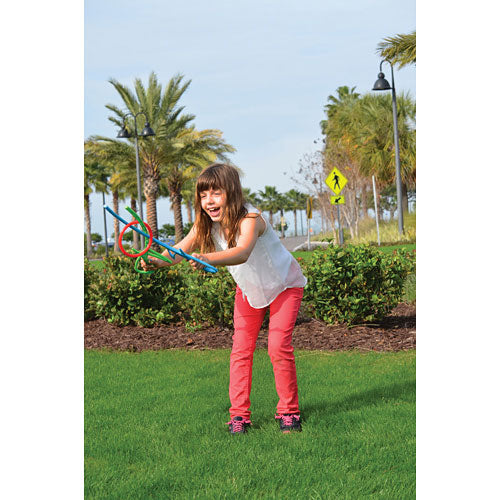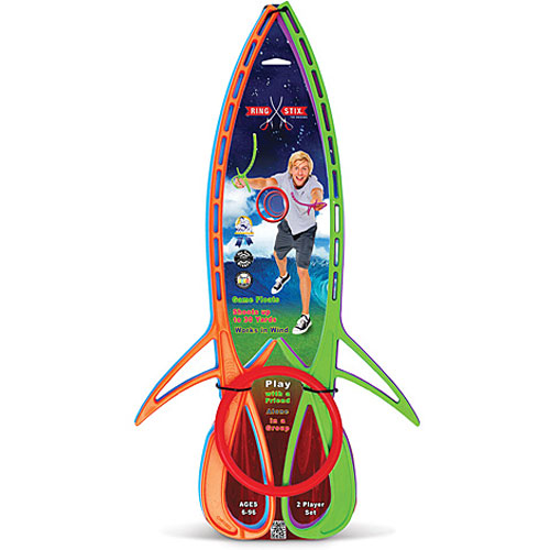 Launch the rings by putting both Stix through the ring–then quick! Pull the Stix apart. Send it flying 30' in the air while the other player tries to catch it with one of his Stix. It’s endless fun in all wide-open spaces. Includes 4 colorful Stix and 1 red ring. For ages 6 yrs-teen.