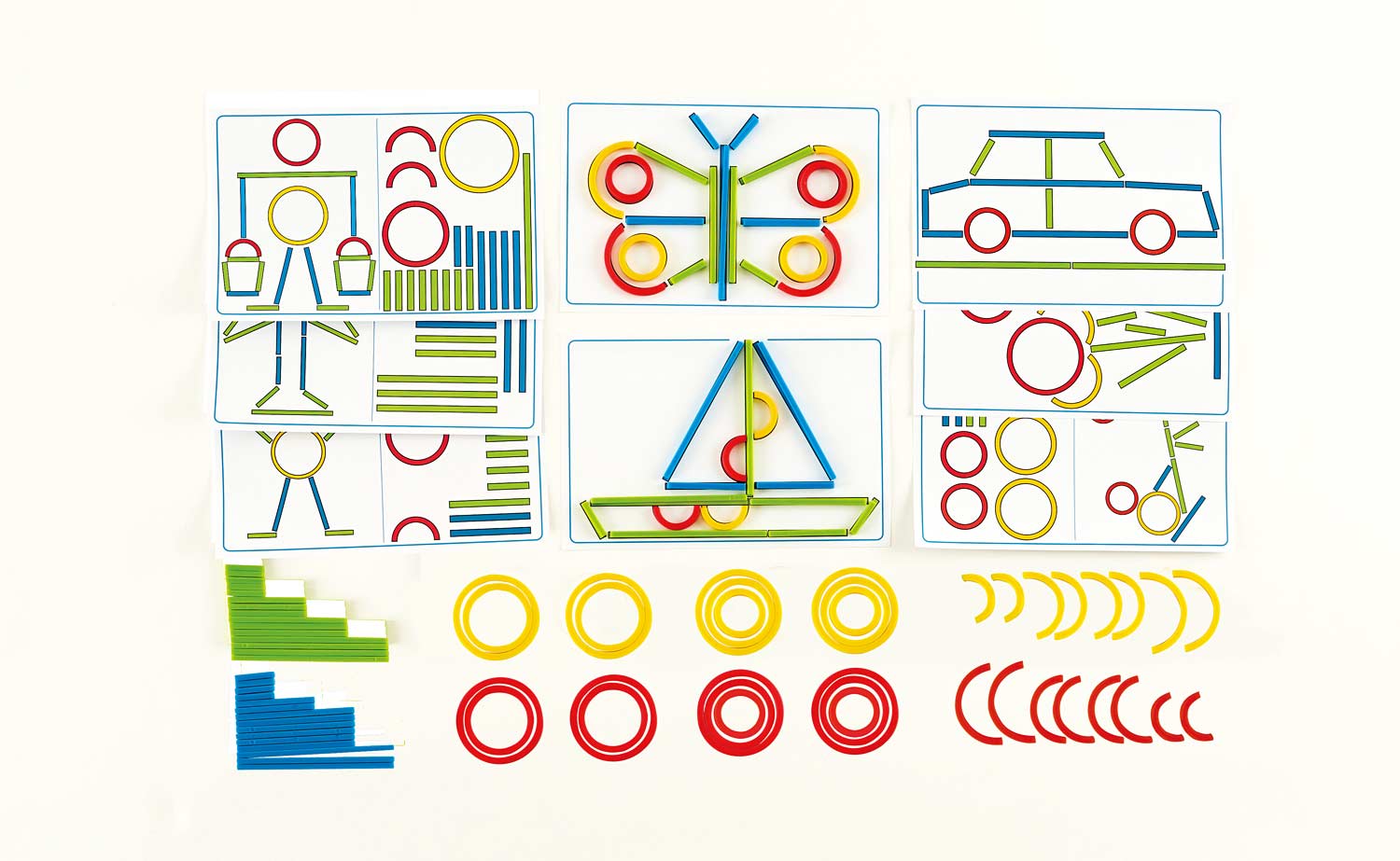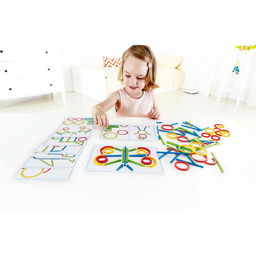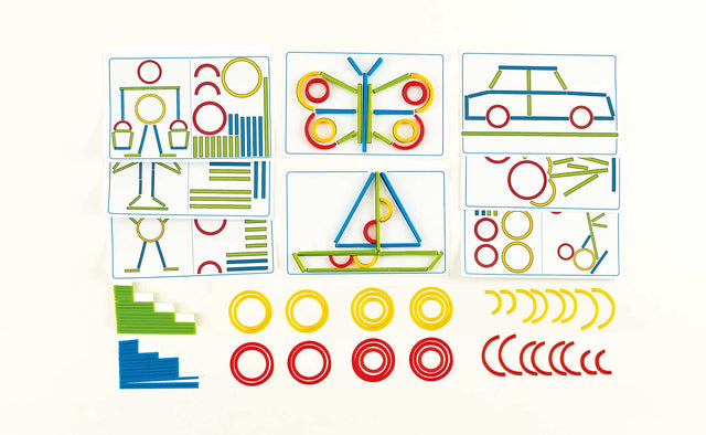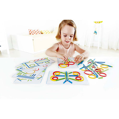 Using the colorful plastic shapes, copy the colored outlines of the game card picture.