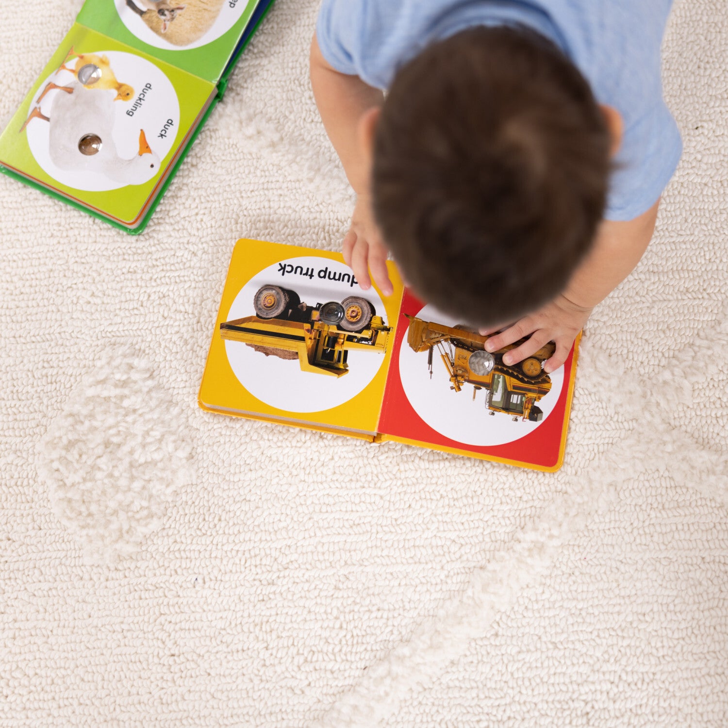 Dig in to the exciting world of construction vehicles! See the pictures, name the vehicles, and poke the irresistible buttons on every page to hear satisfying “clicks” and “pops.” This sturdy 10-page interactive board book invites kids to pop along as they explore full-color photographs of construction vehicles (an excavator, dump truck, backhoe, etc.). Poke-a-Dot® books help encourage language development, animal recognition, and fine motor skills. Patented Pop-a-Tronic™ technology lets kids one and older discover different popping sounds by poking the dots from the front or the back, with pages raised or flat!