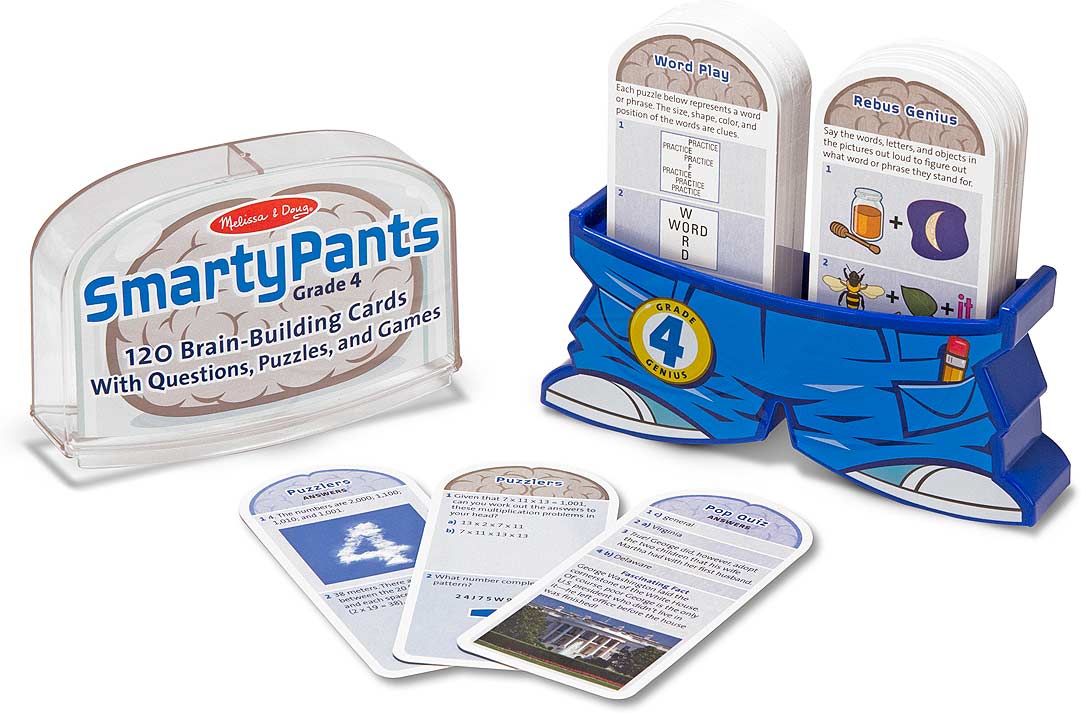 Smarty Pants Fourth Grade cards let kids test their smarts and load up on new facts and funny trivia. Designed for independent use (so a child can play alone or with a parent or friend), the cards are colorful, creative and packed with illustrated activities, including trivia quizzes, problem-solving puzzles, rebus puzzles, fun facts, creative story-building games and much more. Each card set is thoughtfully developed to suit the learning style and curriculum standards of each age range . . Then spiced up with fresh, lively design and an infusion of humor (including a whimsical pants-shaped case!) to keep kids giggling, engaged and excited about learning.