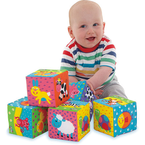 6 foam-filled fabric cubes with colourful animal pictures. Soft and safe, ideal for squeezing, throwing and building. Progress to matching the 12 pairs of animals and joining the animals walking along a path and counting 1 to 6. Machine washable. Packed in reusable bag with carry handle.