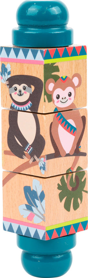 When will the cubes stop at the right positions? The goal of this spinning cubes puzzle made of FSC® 100%-certified wood is to sort the modern animal motifs correctly with the colors matching. The wooden cubes are held together with a wooden pole.