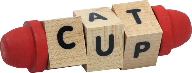 Three blocks, with letters printed on 1" by 1-1/4" faces, spin to make dozens of simple words. Great for early reading skills. All hardwood construction. Spinny Speller measures 5" long overall.