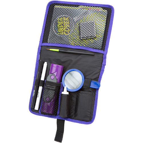 Everything for the super sleuth on the go. Sleek black nylon case contains binoculars, magnifying glass, fingerprint powder, brush, flashlight, secret marker pen set and a printed spy guide. Can be carried by the convenient handle or looped through the belt.