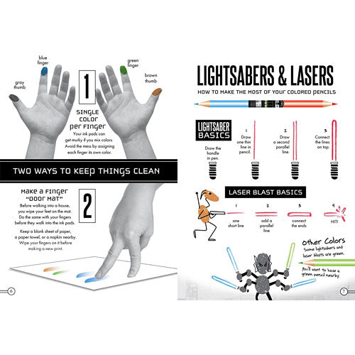 Use the 4 ink pads, marker, and dual-tipped, lightsaber pencil to make thumbprint versions of your favorite Star Wars characters. Simple step-by-steps include clone troopers and battle droids, Ewoks and Wookies, Jedi and Jabba the Hutt. Star Wars fans will love re-creating key moments from the movies and creating scenes of their own.