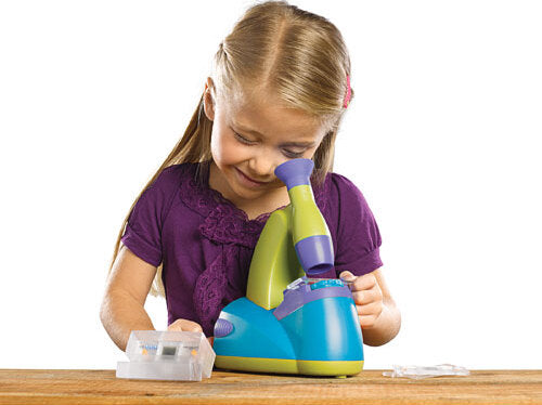 Includes Talking Microscope with 5x focusing magnifier, 12 slides, and light for easy viewing