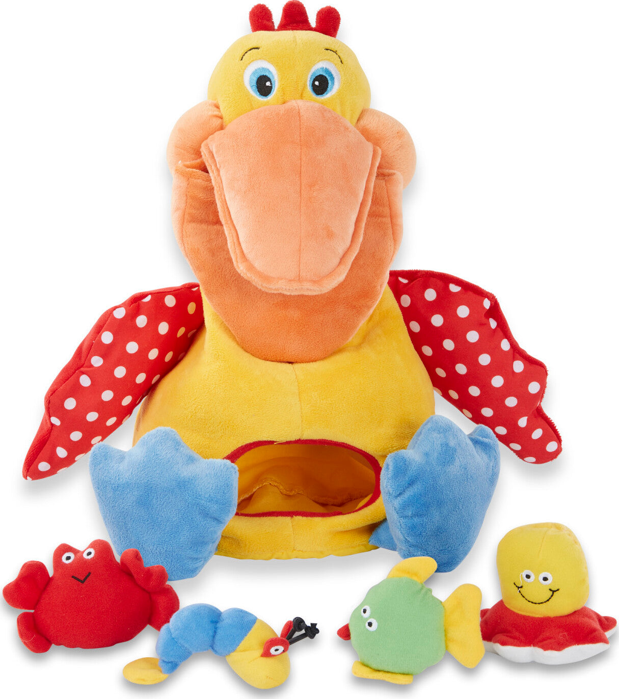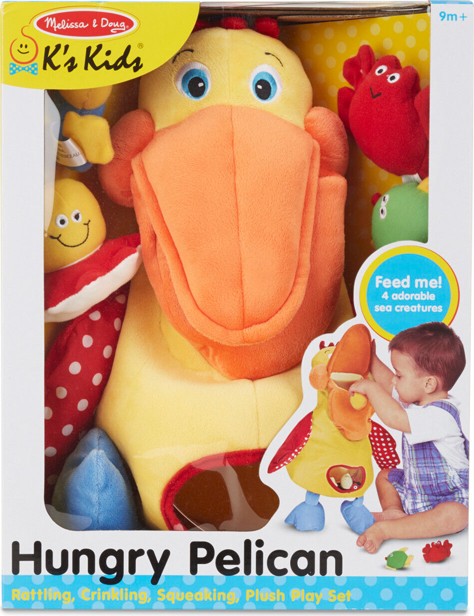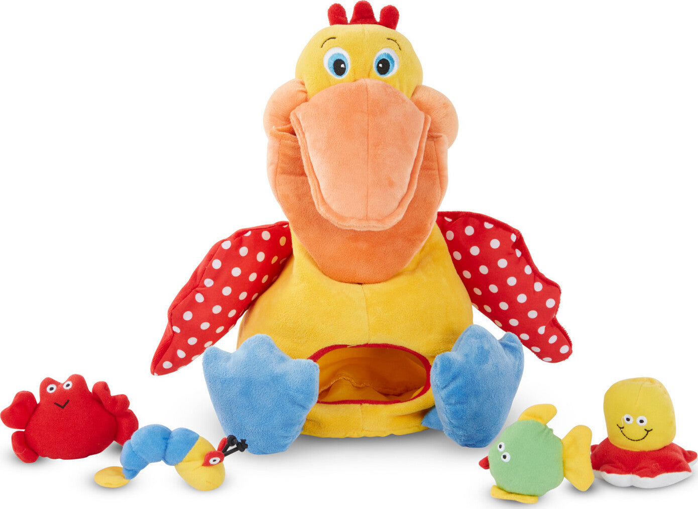 This cuddly plush pelican has an empty belly ... And a big appetite for fun! Young children can open the pelican's big bill (which squeaks when squeezed!) to drop four mini plush animals into his open mouth. Then the crinkly shrimp, squeaking octopus, and rattling fish and crab drop right into the bird's big belly! A peek-in, reach-in window on the pelican's front lets kids spot them easily and pull them out to try it all again. The repetitive activity is great for babies and toddlers working on motor skills and other early developmental skills. And thanks to an incredible array of fun-to-explore features-from chubby, squeak-able cheeks to crinkly wings to floppy, rattling feet-it never gets old!