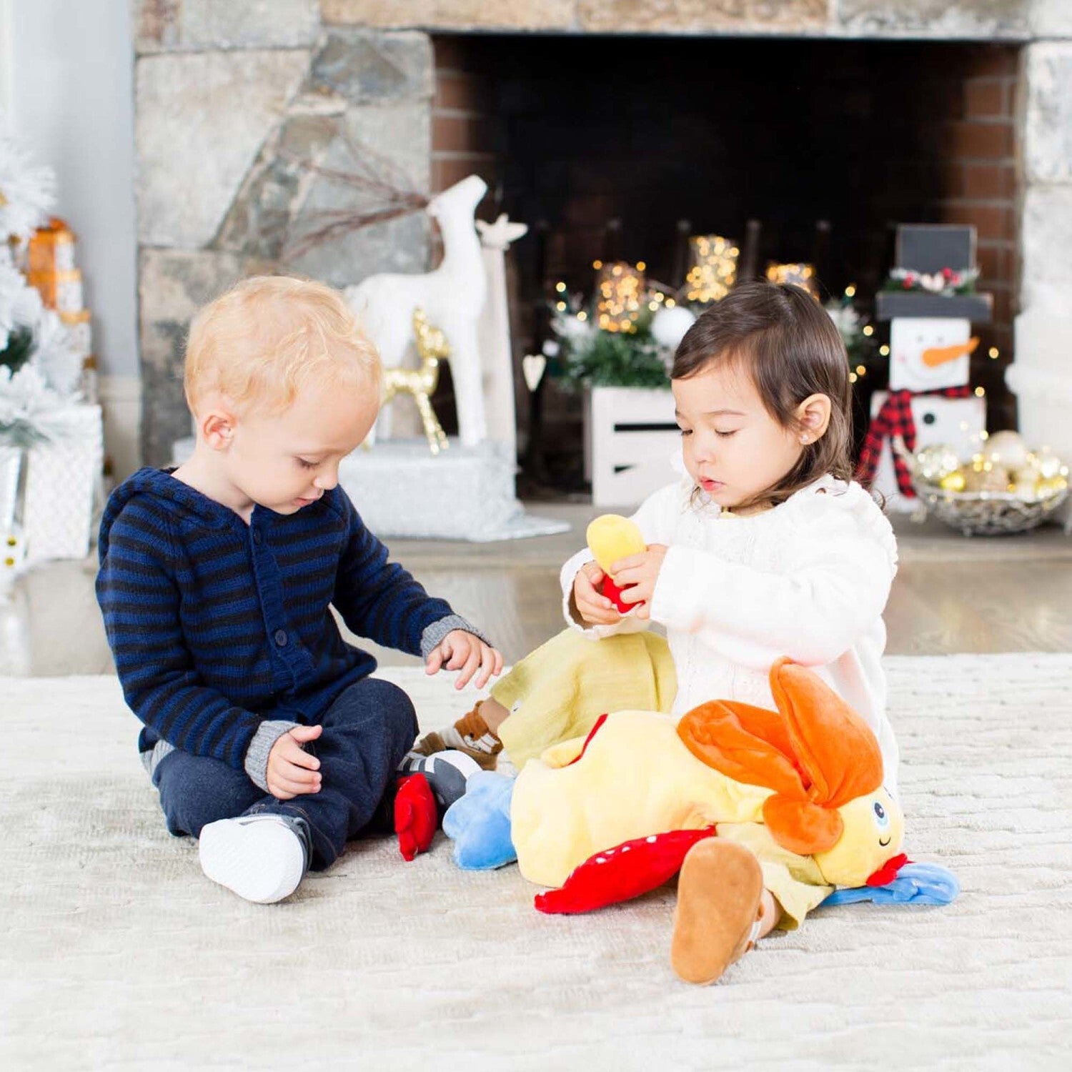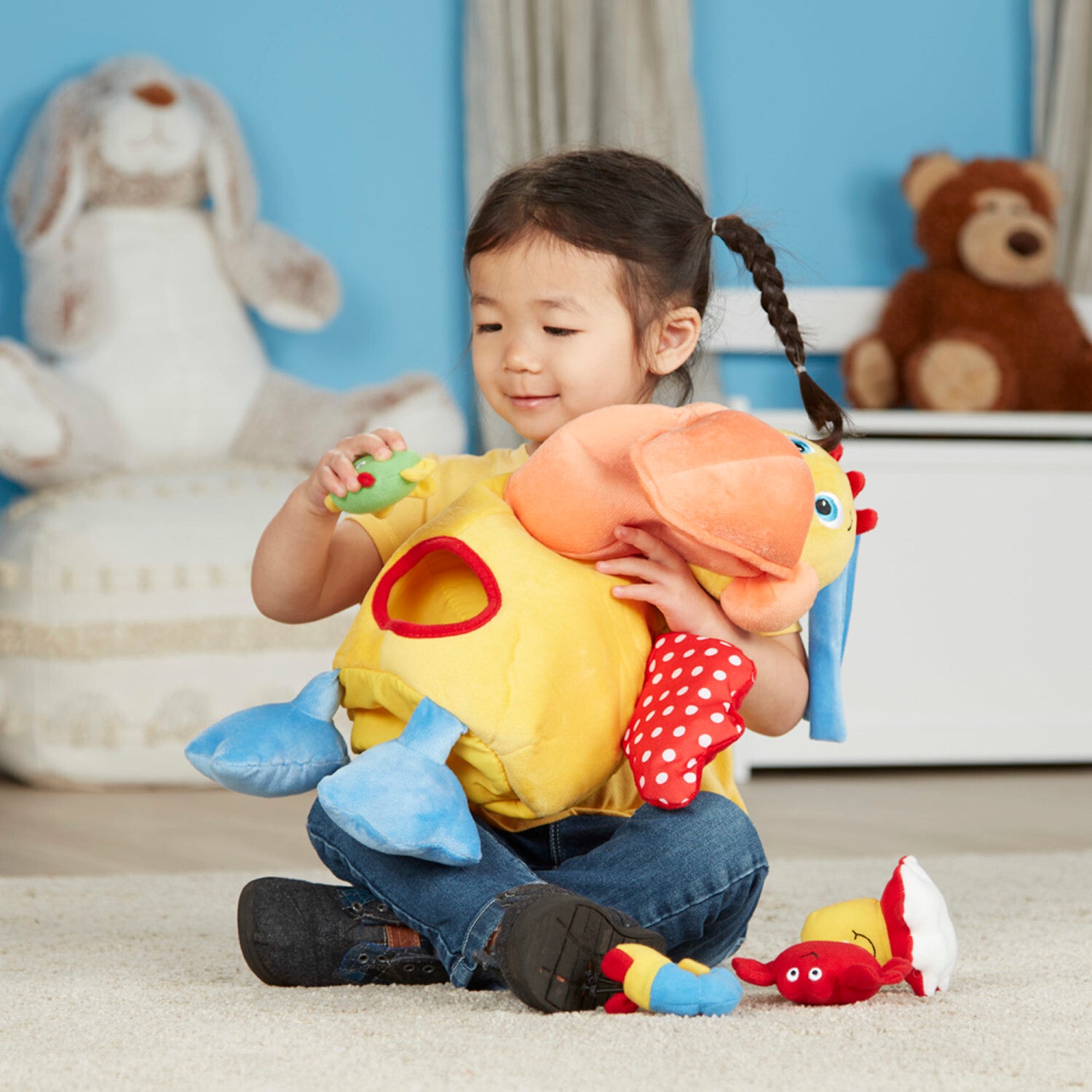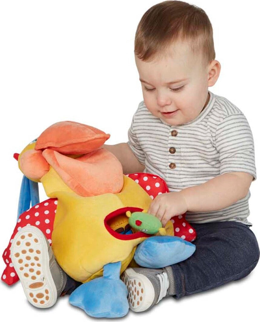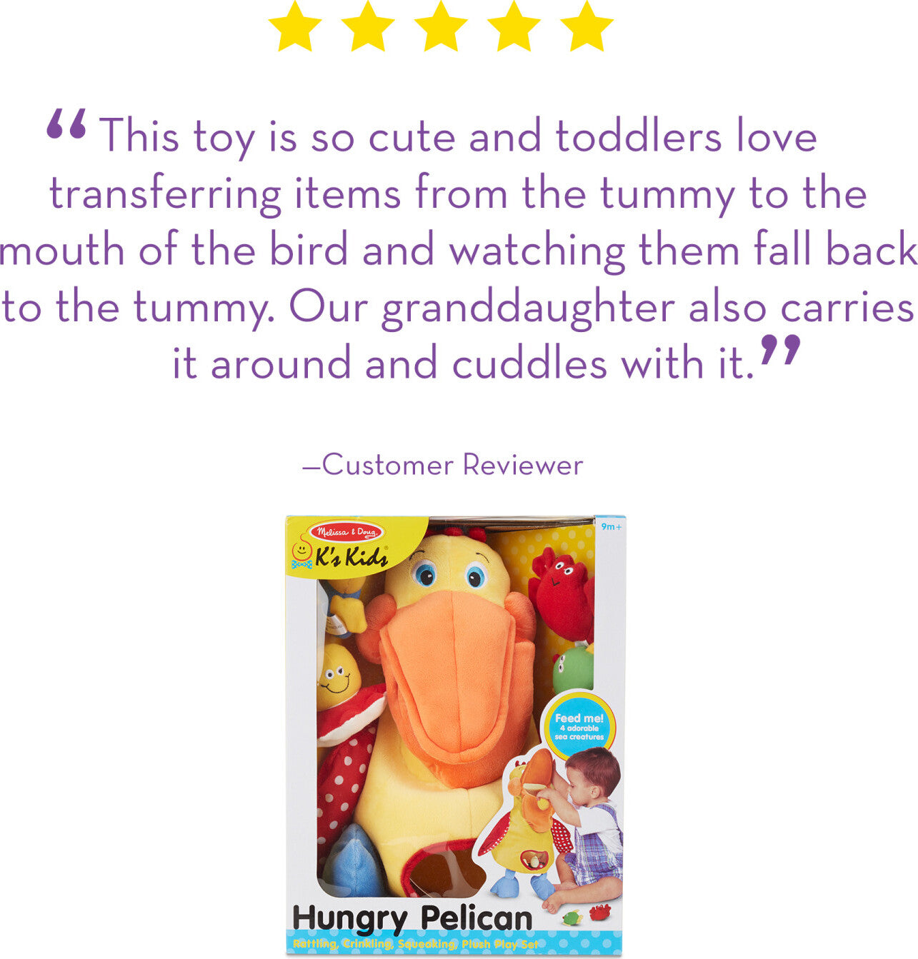 This cuddly plush pelican has an empty belly ... And a big appetite for fun! Young children can open the pelican's big bill (which squeaks when squeezed!) to drop four mini plush animals into his open mouth. Then the crinkly shrimp, squeaking octopus, and rattling fish and crab drop right into the bird's big belly! A peek-in, reach-in window on the pelican's front lets kids spot them easily and pull them out to try it all again. The repetitive activity is great for babies and toddlers working on motor skills and other early developmental skills. And thanks to an incredible array of fun-to-explore features-from chubby, squeak-able cheeks to crinkly wings to floppy, rattling feet-it never gets old!