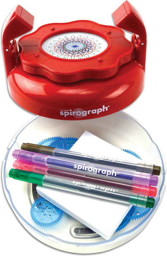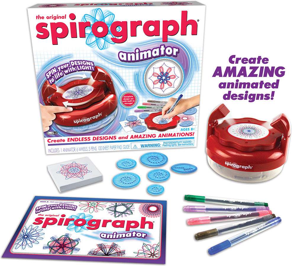 A childhood classic gets a new 3D spin with cool LED lights! The animator has a spinner platform that makes every design move in a different way with each of the rotating light effects. Additional features include a built-in storage compartment underneath and an easy-on/off button. You'll also get 6 wheels, 5 fine-line pens, a 100-sheet pad and of course an instruction guide, so start swirling! Compatible with other Spirograph sets. Requires 3 AAA batteries, not included.