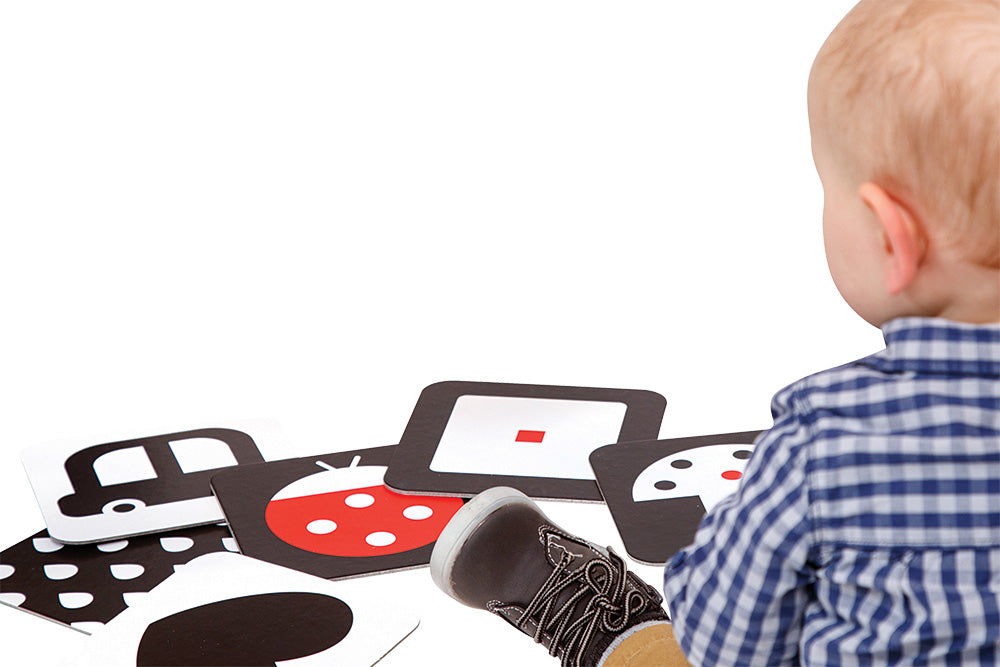 Perfect for the first steps toward perception training and recognizing visual cues. Babies only see high contrast colors and distinct contours, so this handy box of oversized flash cards of shapes and objects fits just right! Early development guide included.