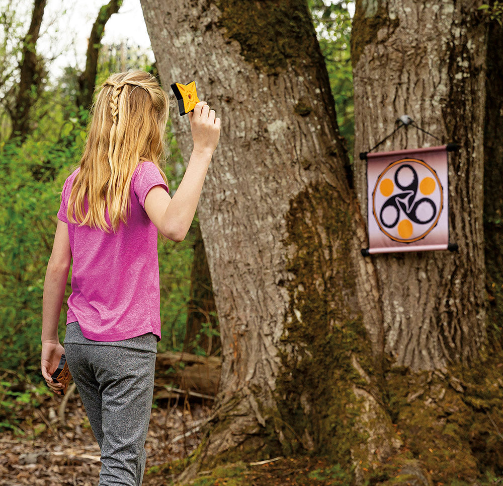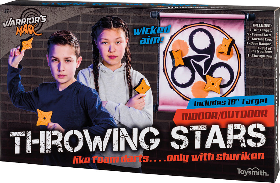Here are 3 foam stars–soft versions of the traditional Japanese ones–to throw at an 18" target, honing your silent ninja skills. Perfect indoors, outdoors, or on the go in its travel bag.