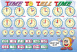 Time to Tell time placemat depicts clocks with time on the hour and each 5 minute interval. There are also some digital clocks too. The reverse side has related time telling interactive exercises.