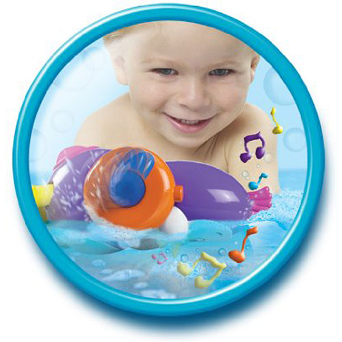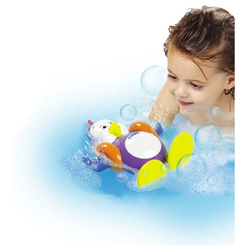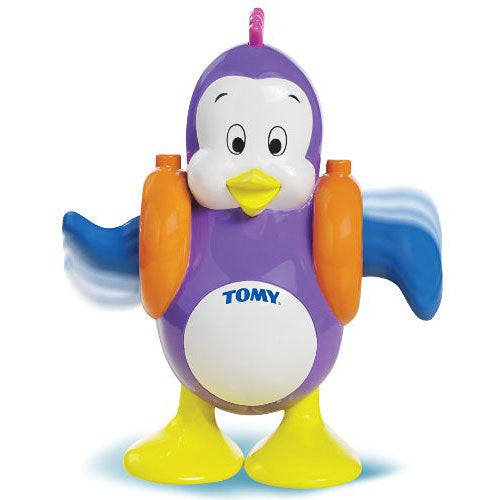 Wind up the Penguin and lie him on his back in the water and hear him hum "Row Row Your Boat" as he flaps his arms and swims through the water