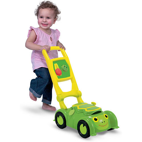 Cheerful Tootle Turtle loves doing his yard work! This cleverly designed plastic lawnmower has lots of ways to interest little ones: A storage compartment under the shell, a plastic fuel can to "pour," clicking dials and a pull-cord that makes a motor sound!