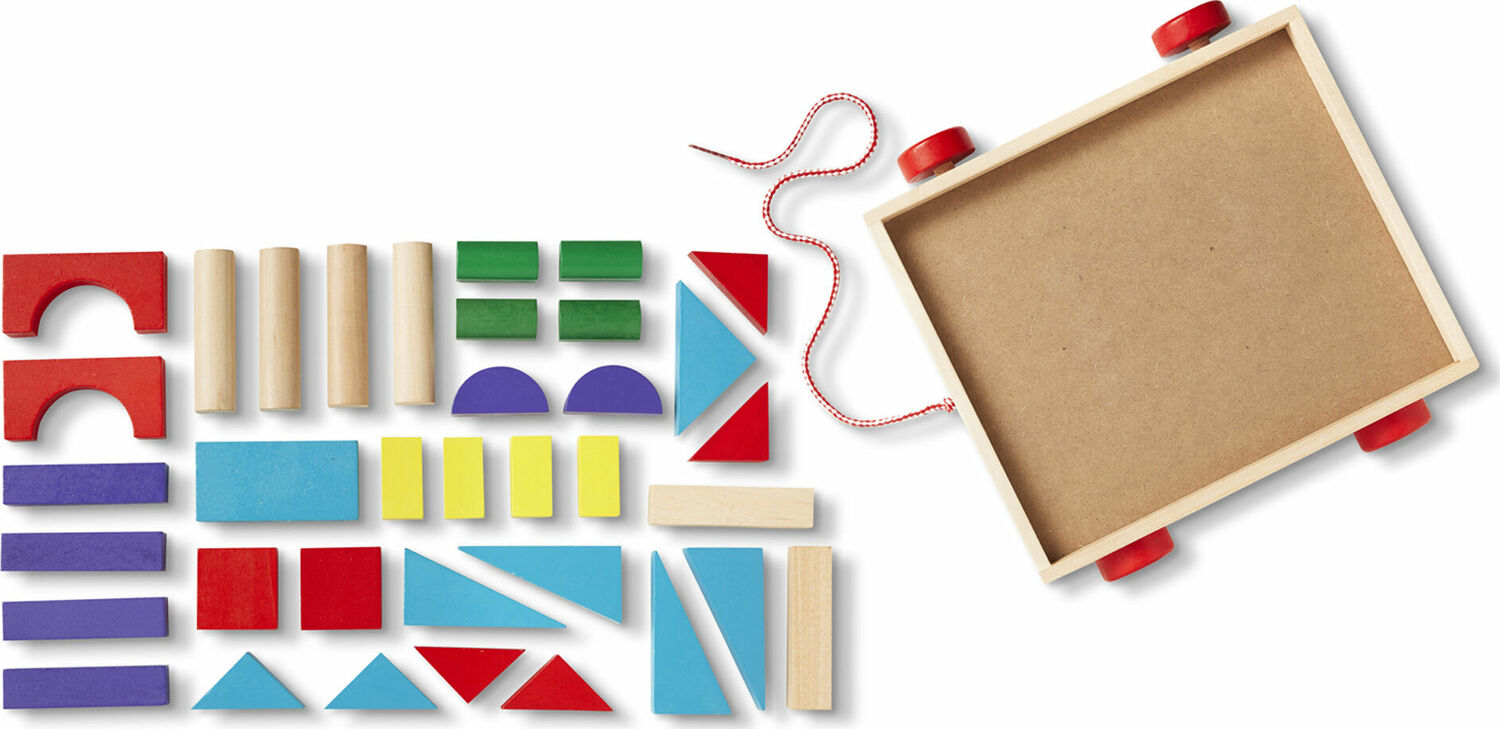 The bright colors on these 36 wooden blocks will inspire lots of creative stacking and building. All the blocks fit neatly into a sturdy wooden pull-along cart! An outstanding value! Unit blocks are the ideal way to introduce the concept of part to whole.