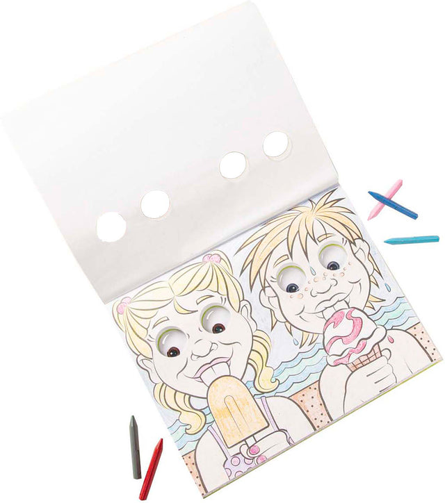 The eyes have it! Color in 30 pages of silly pairs of faces with wiggly, wacky eyes! Jiggly googly eyes peek through cut-outs on every page. If kids remove a page from the jumbo-sized pad, there's an additional page of "extra eyes" to cut out, color in, and tape to their artwork! Thick quality bond paper is perfect for markers, colored pencils, crayons, or paints. This unique coloring pad is sure to be a favorite of kids with an artistic "eye"!