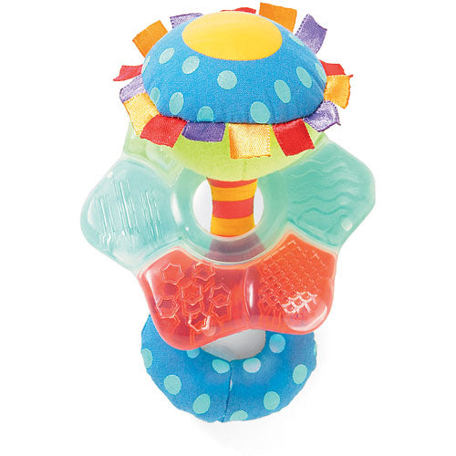 Teething babies will enjoy this muti-faceted soother. Sized perfectly for little hands to hold, this colorful water teether also has a rattle and ribbons that babies can't resist.