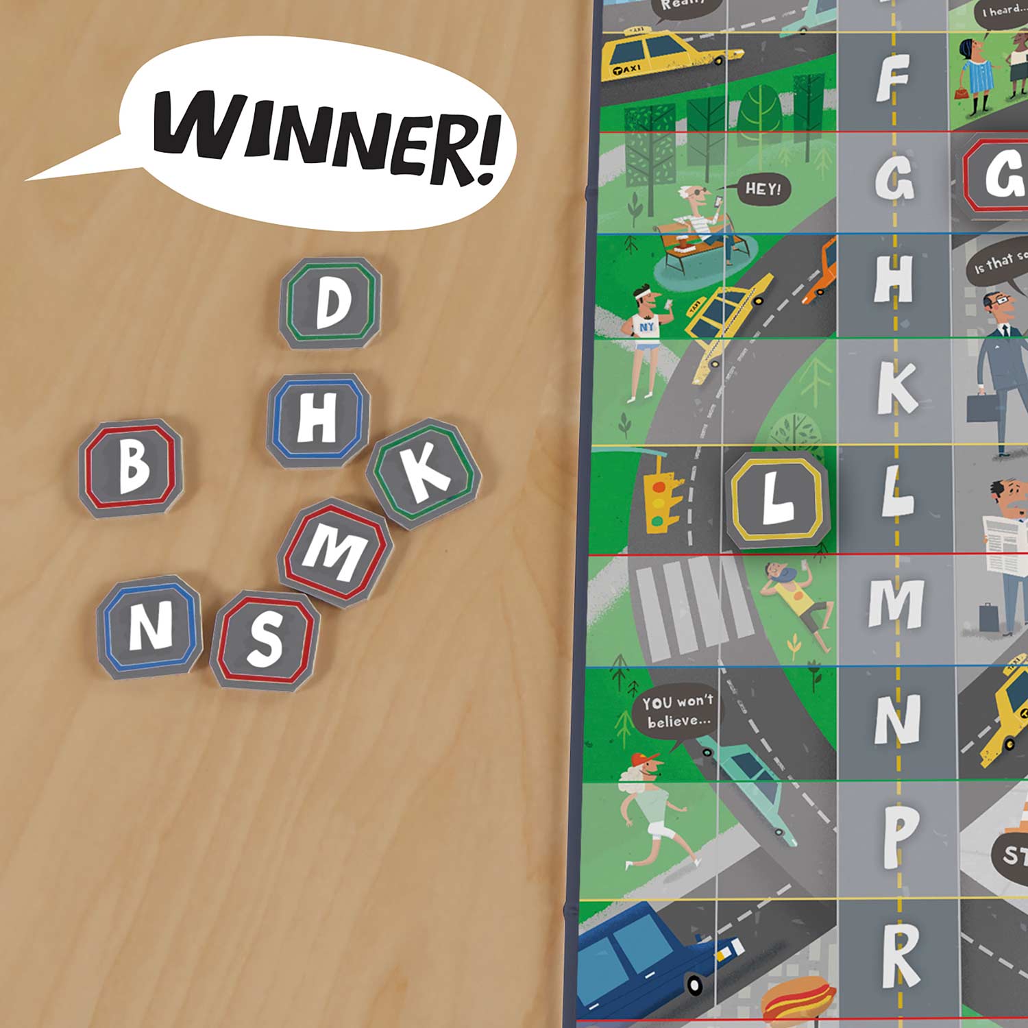 Take the fast lane to fun with this hilarious tug-of-words game! Draw a category card and set the timer to think of the best possible word to fit the selected category. Move the consonants in your chosen word to your side of the street before time runs out! First player to move a letter all the way off the board claims the letter tile. The first wordsmith to collect eight letter tiles wins!