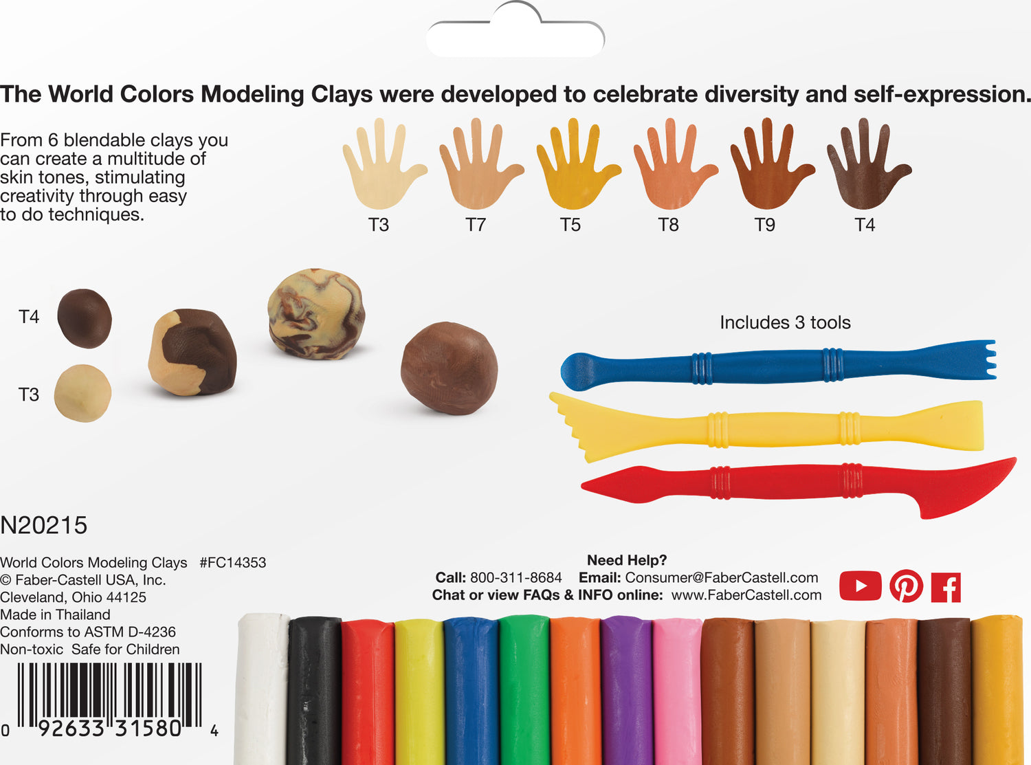 Introducing World Colors Modeling Clay! This 18-piece set includes: 6 blend-able skin tones, 9 vibrant colors and 3 clay modeling tools.