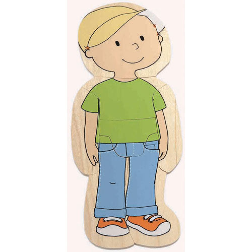 These puzzles show in a clear and child-like way the makeup of a human body: From the skeleton to the organs, the muscles, to the skin and to the dressed child. Each layer has seven pieces. Children learn about the body as they match puzzle pieces.