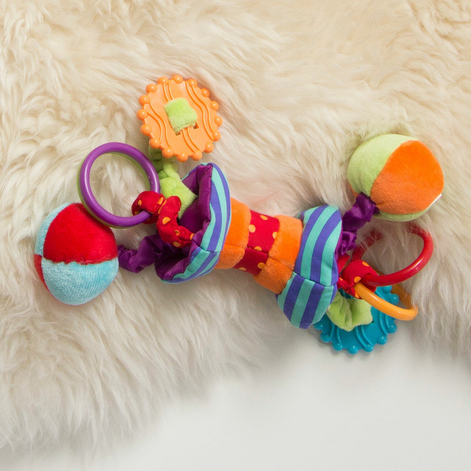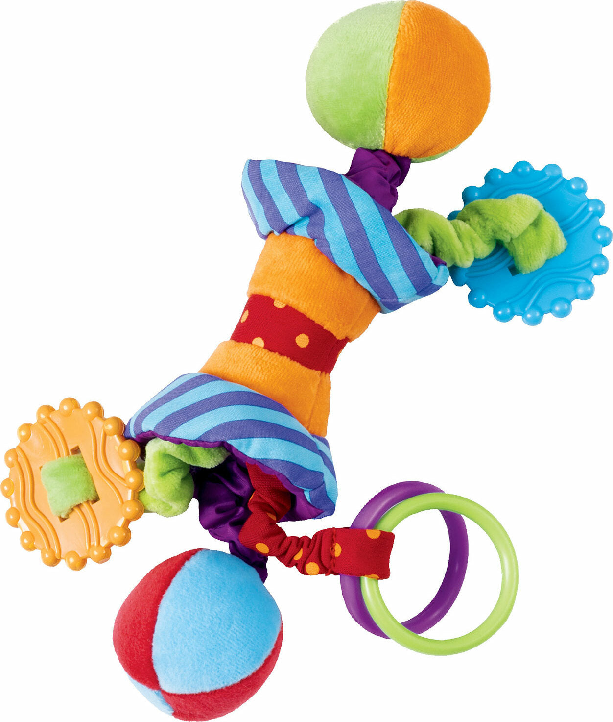 Soft, safe, and springy Ziggles puts many favorite textures and activities at a baby's fingertips. Ringing balls, smooth ribbons, and soothing teethers are all attached to the toy's main body by unique elastic tethers.