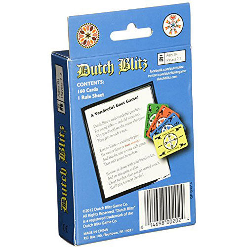 We have developed a limited edition of our Vonderful Goot Classic Green game that allows you to play with up to 8 players. Insane! And, here's the thing. You can play with this New Blue pack - just like Classic Green - with up to 4 players OR combine the two packs to play with 5, 6 , 7 or 8 players. Outta control! So, what makes New Blue different? It's simply a reinvention of the Classic Green boxed game that you know and love, with the colors of the 4 decks' designs (carriage, bucket, pump and plow) switched to enable more players. Yes, it's that simple and that awesome. Ready to play? Let's go. Can be played just with this deck or combined with other decks 4 new card colors Allows up to 8 players when combined with original Dutch Blitz