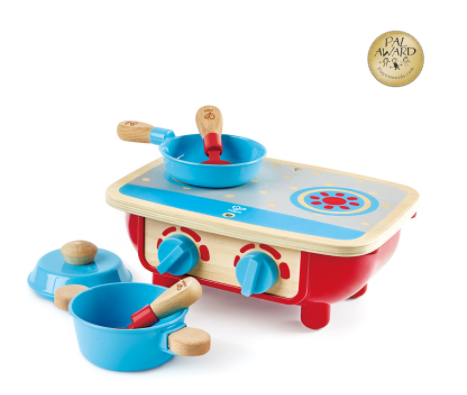Prepare delicious meals for your family and friends! This fun wooden stove comes with one pot with lid, one frying pan, one spoon and one spatula for you to cook with. Features knobs which click cutely when turned. Store your pot and pan in the spaces behind the hob when you`re done.